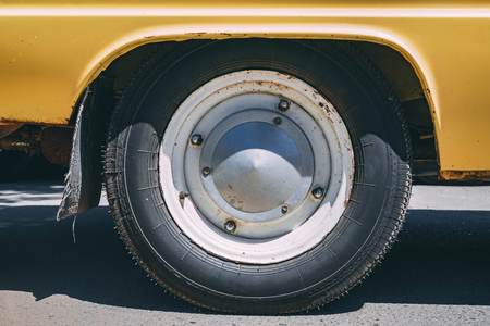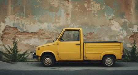 A classic yellow pickup truck parked near an aged wall with weathered textures. Ideal for concepts about rural life, craftsmanship, and vintage transportation.