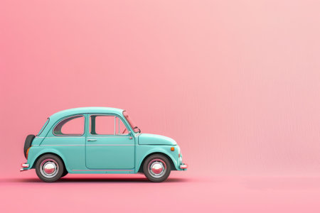 Travel blue car model. Top view. Pink, blue Punchy Pastels background. Minimal style concept