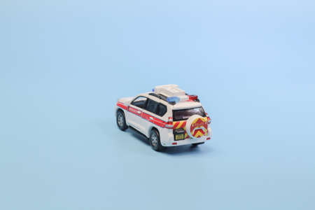Kids toy car on trendy colorful background. Baby blue car top view on double colored blue paper. Boys game. Travel and sport lifestyle. Business, transportation concept.