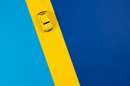 Vilnius, Lithuania - December 6, 2019: Small yellow retro toy car on yellow and blue background. Top view