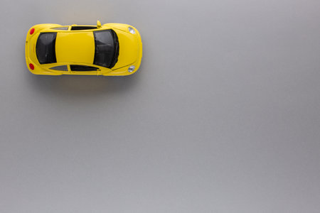 Car rental, trip, travel or weekend activity concept flat lay with yellow small toy cabriolet car on yellow background