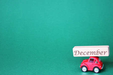 A small red toy car carrying a wooden block with the inscription December on its roof. Green background. Christmas and new year holidays are approaching.