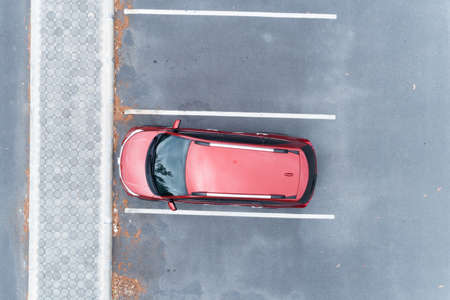 Aerial view top down of red SUV car parked at concrete car parking lot with white line of traffic sign on the street. Above view of car in a row at parking space Outside car parking area.