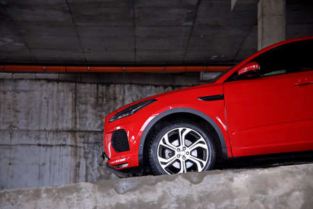 Red car on the concrete ramp at multi level car parking garage