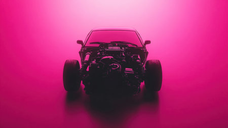 A striking silhouette of a car engine, set against a vibrant pink background, highlights the intersection of art and automotive innovation. Perfect for enthusiasts.