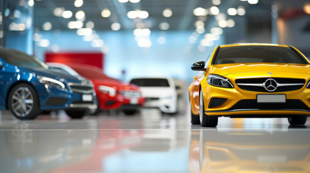 Modern car showroom with various sleek vehicles on display, showcasing luxury and design
