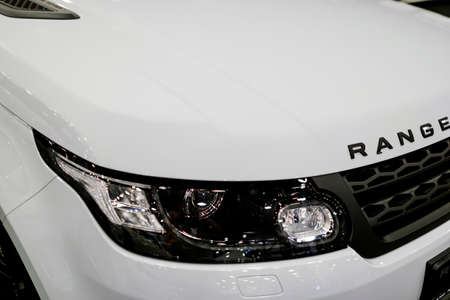 Sankt-Petersburg, Russia July 21 2017: Front view headlight of a white Land Rover Range Rover Sport 2017. Car exterior details. Photo Taken at Royal Auto Show July 21