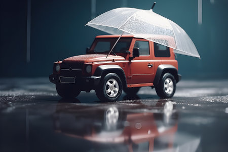 car insurance concept. Toy car under umbrella on a blue background. copyspace. Generation AI