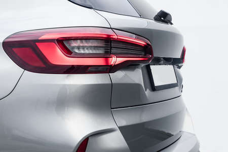 The back of a silver expensive crossover car: bumper, trunk lid, taillight on the back white background. Mock up for the advertising industry. New car concept