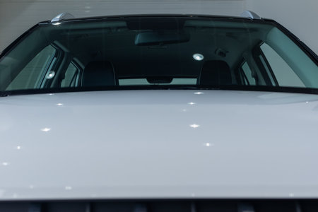 White front hood of modern car against background of windshield close-up