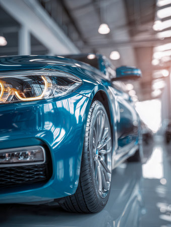 A striking blue high-end vehicle on display within an elegant showroom, highlighting its polished alloy rims and illuminated front lighting amid glaming surfaces an
