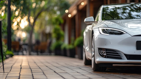 A stylish white car parked on a beautifully paved street surrounded by lush greenery. The urban setting exudes modern elegance and tranquility.