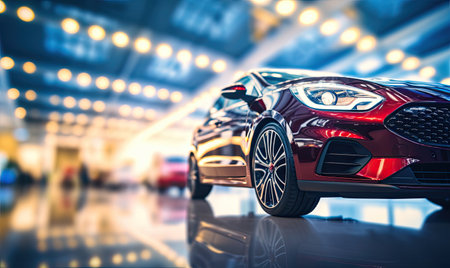 Close-up photo of shiny car and another one in blurred background standing in bright car rental interior
