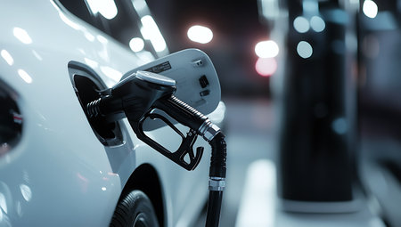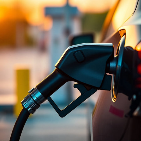 Close-up of a fuel nozzle inserted into a car at a gas station, illustrating daily refueling and energy needs.