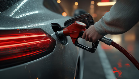 A close-up of a hand refueling a car at a fuel station, with the nozzle in action and the background showing a modern station setup