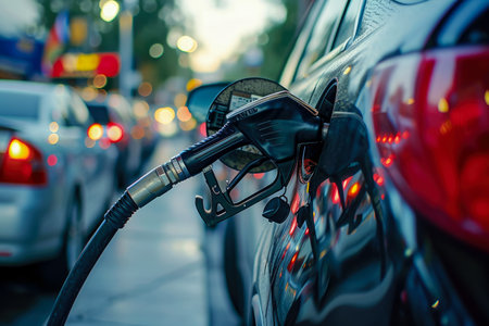 A close-up view of a fuel pump nozzle inserted into a car's gas tank. This image captures the process of refueling with gasoline at a gas station, emphasizing modern transportation and consumer behavior.