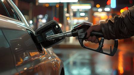 A close-up view of a hand gripping a fuel nozzle, preparing to refuel a car at a service station, showcasing the process of fueling in daily life.