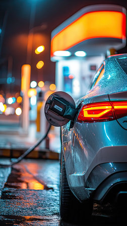 A vibrant nighttime scene of a car being fueled, with colorful reflections and a modern urban atmosphere.