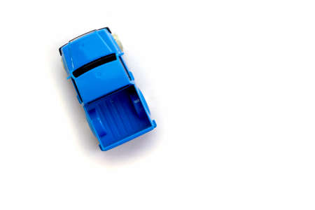 Children's toy little blue car on a white background. Top view. Copy space for text