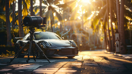 A high-end luxury car parked in a tropical setting with palm trees, captured by a professional camera setup on a tripod, evoking a stylish and cinematic atmosphere.