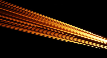 A dynamic abstract depicting numerous bright streaks of orange and yellow light rapidly moving from left to right across a dark, almost black background. The lines are sharp and distinct at the leading edge, blurring into a luminous trail, conveying a strong sense of speed and motion. The intense glow of the light creates a powerful visual impact, suggesting concepts of velocity, technology, or energy transfer.