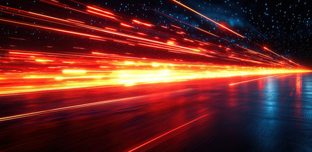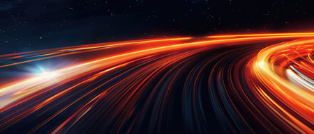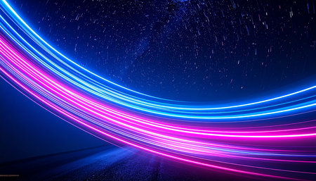This abstract image features vibrant light trails on a dark background, creating a sense of dynamic movement and energy. Perfect for technology or artistic themes.