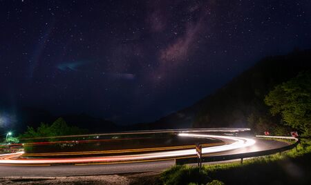 Cars light trails at night in a curve asphalt, mountains road at night, long exposure image