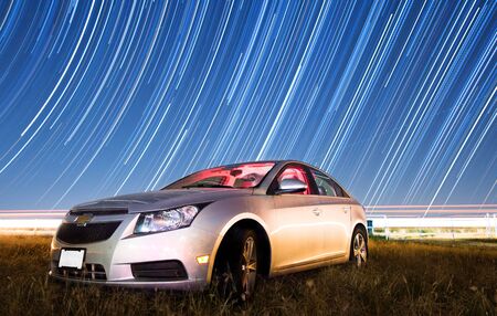 Floresville, Tx / USA - September 25, 2017: Car parked on a night sky filled with star trails.