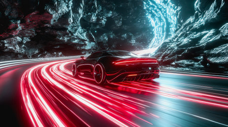 A dynamic scene featuring a futuristic sports car racing through vibrant neon light trails, symbolizing speed, technology, and the thrilling essence of nighttime motion.