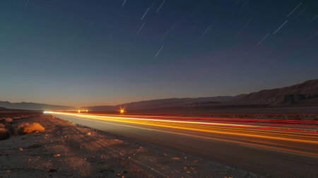 Ghostly trails of light seem to dance across the vast expanse of the desert as cars speed along the straight highway under the blanket of stars