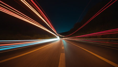 Experience the thrill of a night drive with vibrant light trails capturing the dynamic motion and energy of the urban landscape from a unique perspective.