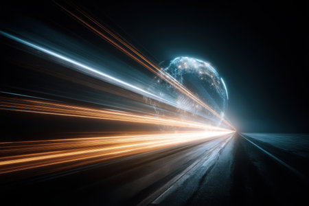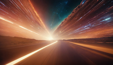 This captivating image showcases dynamic light trails that evoke a sense of speed and motion, set against a star-filled cosmic background.