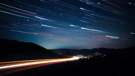 Photo of colorful car light trails and stars at night, long exposure.
