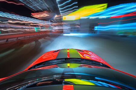View from roof of the red muscle car Car moving in a night city, Blured road with lights with car on high speed. Concept rapid rhythm of a modern city.