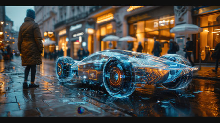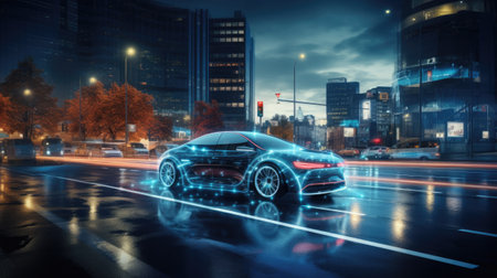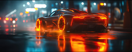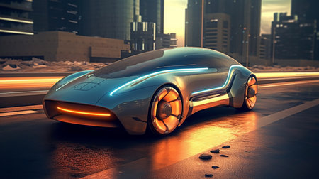 A futuristic car with sleek design and glowing lights is seen driving on a bustling city street at night. The vehicles advanced technology and speed create a dynamic scene against the backdrop of urban lights and buildings.
