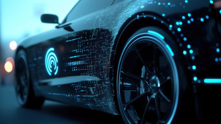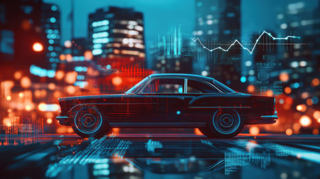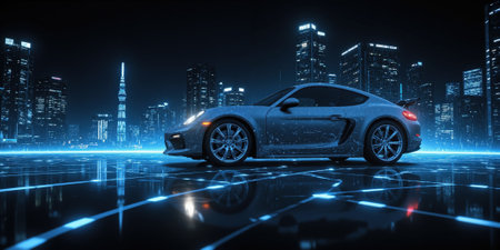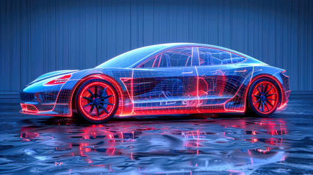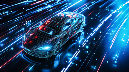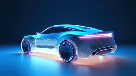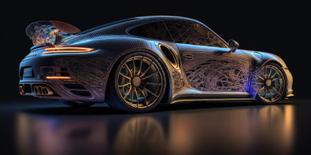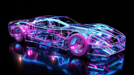 Explore the intersection of technology and automotive design in this futuristic representation of a sports car, enhanced with vibrant neon lights and data visuals.