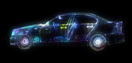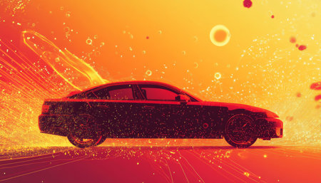 Red car silhouette enveloped by digital particles, symbolizing modern technology and innovation