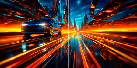 Unique design in bold futuristic style. Breathtaking view of blue light coming from behind the moving car. Evokes a feeling of innovation and modernity.
