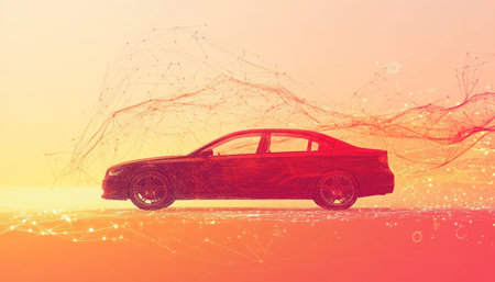 Red car silhouette with digital particles and lines, symbolizing modern technology and innovation