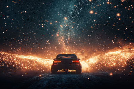 A car is in the middle of a starry sky. The car is surrounded by a glowing orange haze