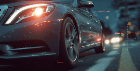 A detailed visual representation of the advanced smart car technology with an advanced heads up display and autonomous driving capabilities.A car navigating urban roads is equipped with graphical radar signals and an intelligent automotive system