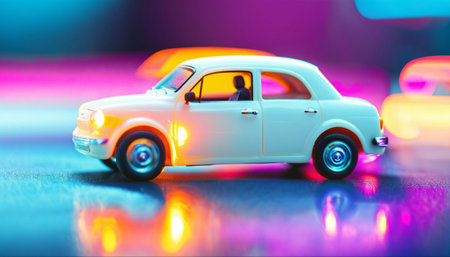 Toy car model floating in the air, isolated in blue-red neon gradient light. levitating objects. Minimal concept