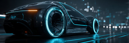 A sleek, futuristic black car features striking blue glowing wheels and accents, set against a neon-lit urban backdrop. The atmosphere conveys a sense of speed and innovation in a modern cityscape.
