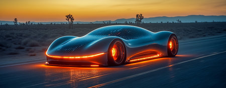 A sleek, futuristic car with glowing accents on a deserted highway at sunset