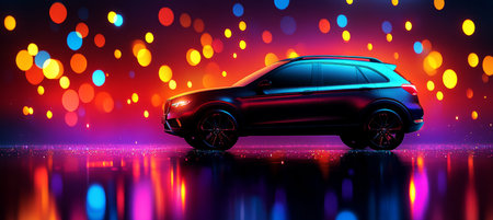 Modern SUV in Vibrant Showroom Spotlights, Luxury Vehicle Presentation with Copy Space