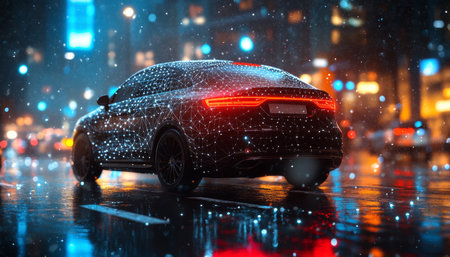 Connected Car in Night City Digital Network Over Futuristic Sedan on Rainy Urban Street