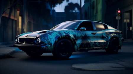 An AI generated illustration of A multicolored sports car featuring intricate design elements on its exterior