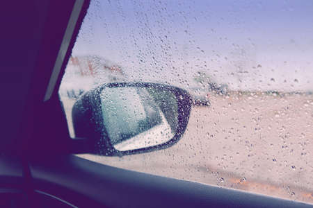Blurry wet abstract glass background. Rear back view car mirror with rain drops during rainy bad weather. Sadness loneliness concept. Toned with retro vintage violet purple filters.