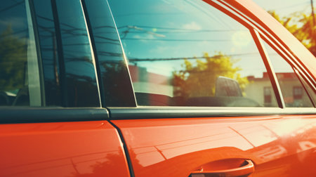 A red automobile parked outdoors in the radiant sun on a summer day provides a mock-up for decals or stickers on its back window.