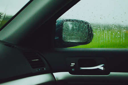 There are raindrops on the passenger window. The photo is taken in the front panel on the passenger side. it's during a rain storm.